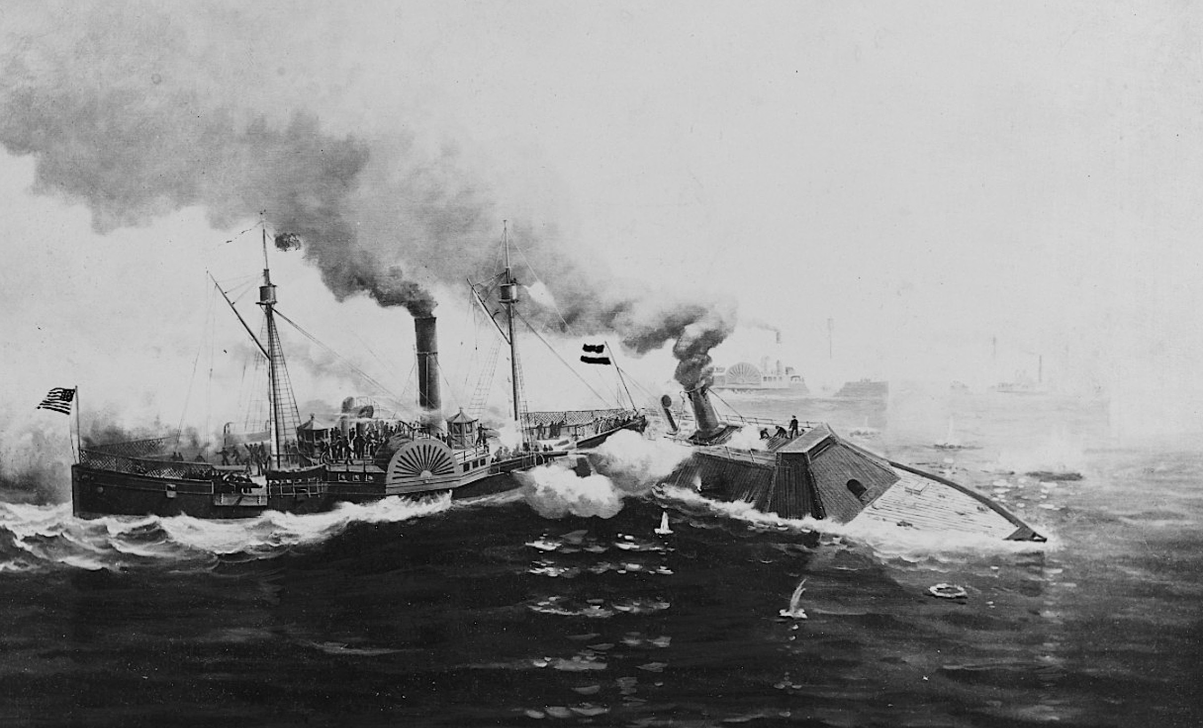 On May 5, 1864, the side-wheel steamer USS Sassacus was one of several Union ships to engage the Confederate ironclad ram Albermarle off the coast of North Carolina. Sassacus’ commander ordered the vessel straight at Albermarle, hitting the rebel ship on the starboard broadside. Sassacus was damaged by the collision and by a shot from Albermarle, which hit the vessel’s starboard boiler. The ships, stuck together for at least 10 minutes, finally separated; despite the efforts of nearby Union warships, Albermarle was able to escape.
