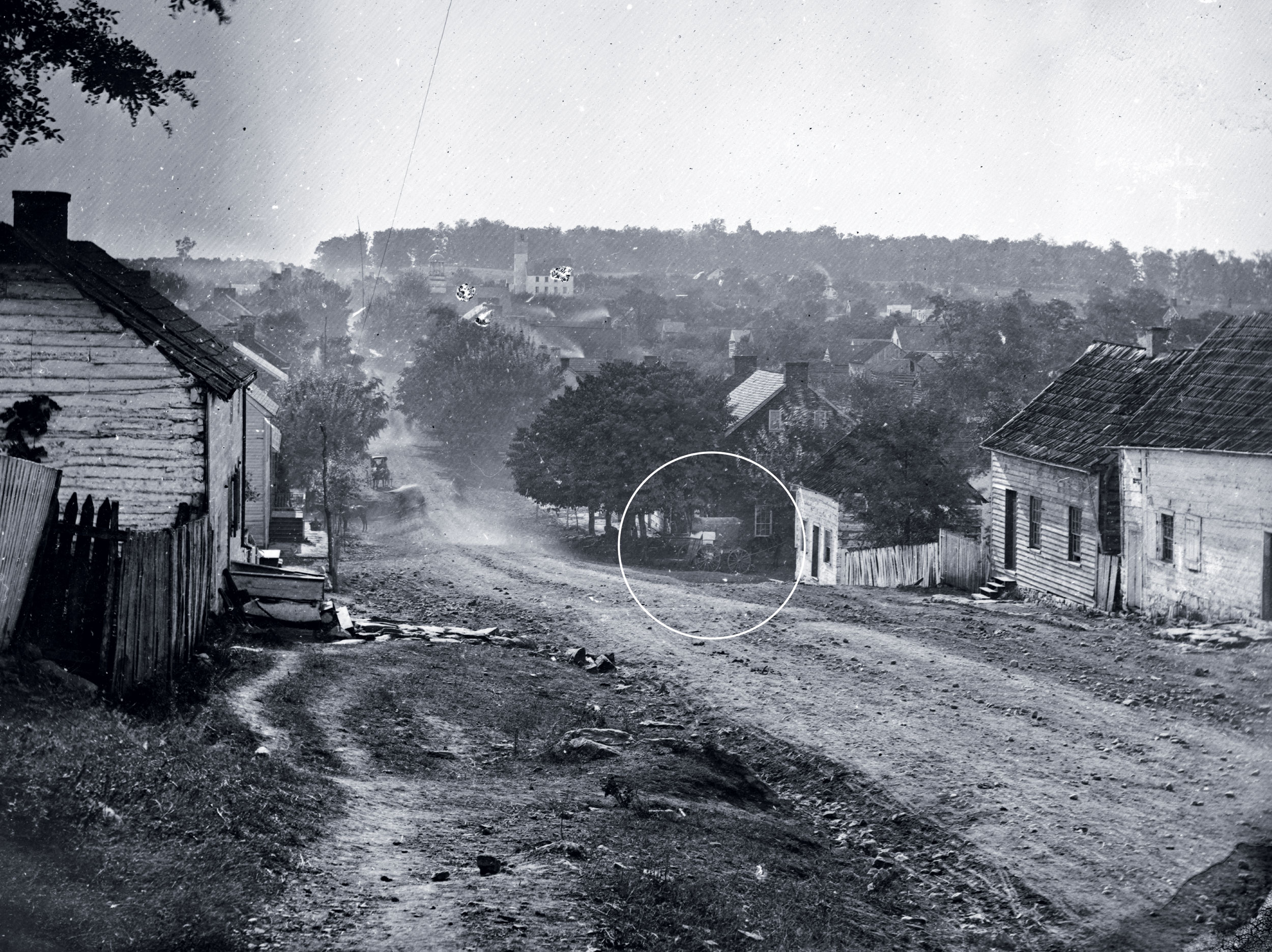 Photographer Alexander Gardner made this image as he looked toward the Potomac River out over the route of the Confederate withdrawal. Gardner’s photographer’s wagon (circled at center left) is visible, distinguishable by the tarp hanging from the back. He would tie that around his legs to keep out the light when he was preparing or developing glass plate negatives in the small darkroom area.