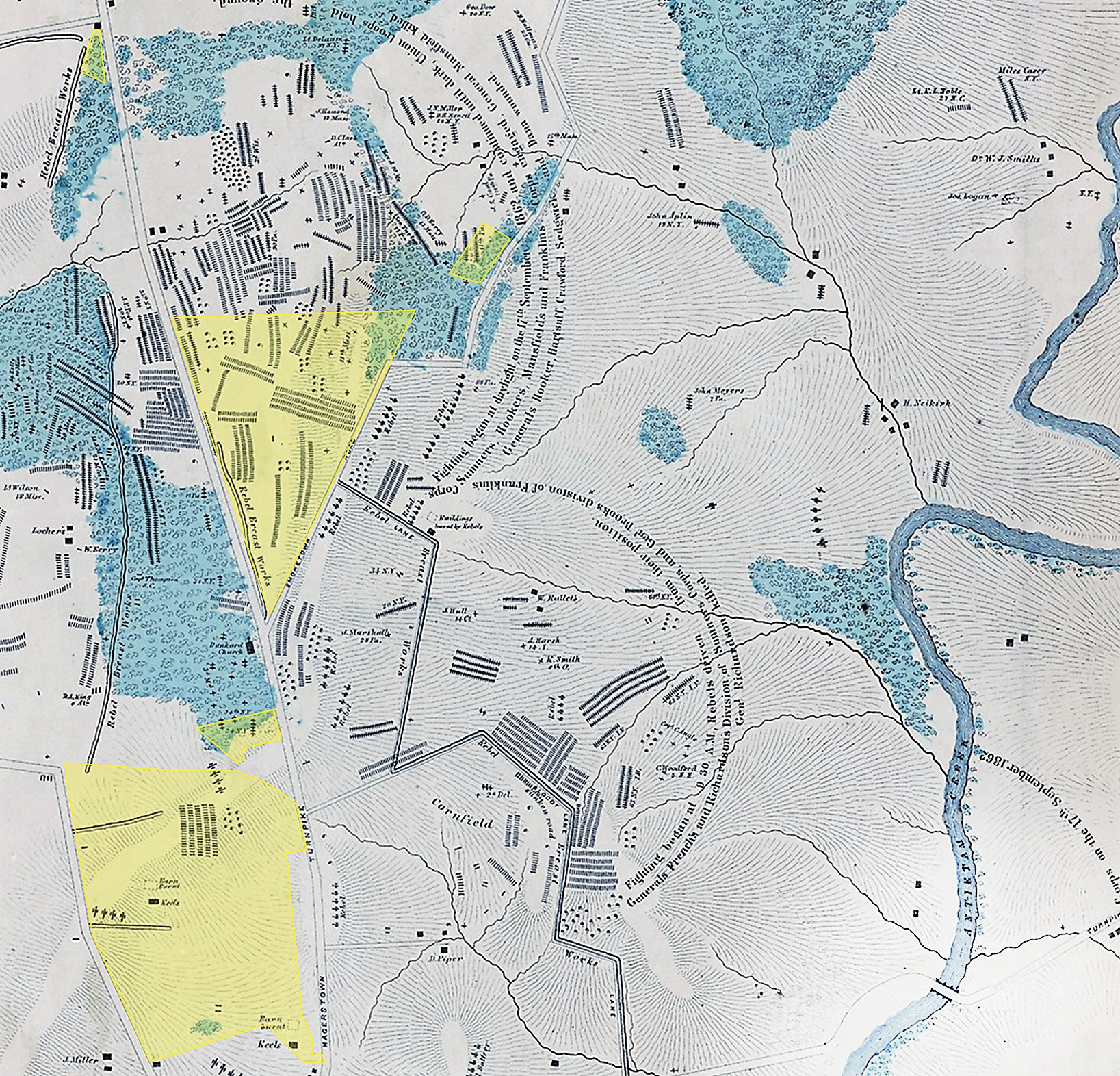 New York Public LibraryUsing S.G. Elliott’s Burial Map as a base, this illustration highlights the properties preserved by the Trust on the Antietam Battlefield, which saw an estimated 673 battlefield burials.