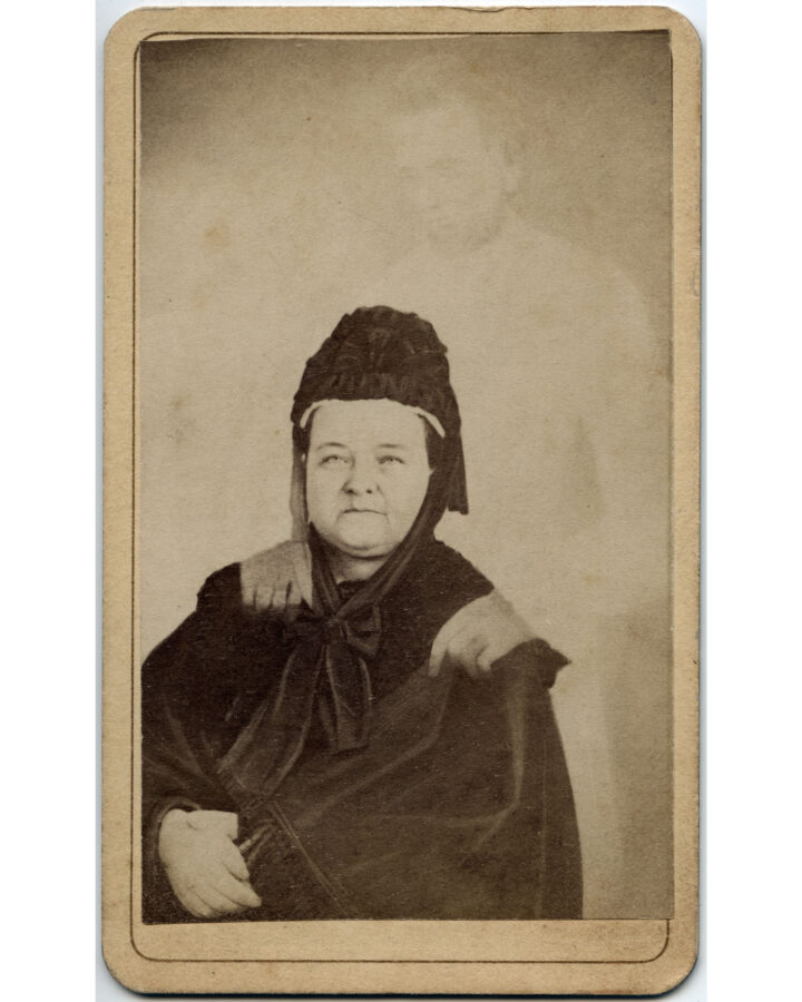 In 1872, photographer William H. Mumler produced this surreal photograph of Mary Todd Lincoln in his Boston studio. Over the previous decade, Mumler had established himself as a well-known spirit photographer—someone whose camera could capture the “ghosts” of deceased loved ones in images he made of his customers. As his popularity grew during the Civil War, questions about his methods—and accusations of trickery—also grew. In 1869, he faced trial for fraud in proceedings that saw P.T. Barnum, the renowned showman and then Connecticut legislator, testify against him. Mumler was acquitted; prosecutors could not prove conclusively that he was doctoring his images. This photo of Mrs. Lincoln—which purports to have captured the specter of her dead husband standing behind her, the president’s hands resting on her shoulders—was Mumler’s most popular work. He died at 52 in 1884, taking to his grave the process behind his spirit images.