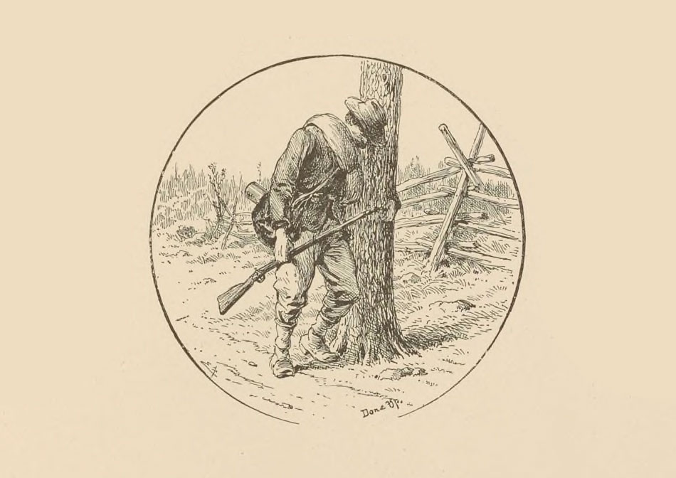 Illustration of a Civil War soldier carrying a musket and leaning against a tree.