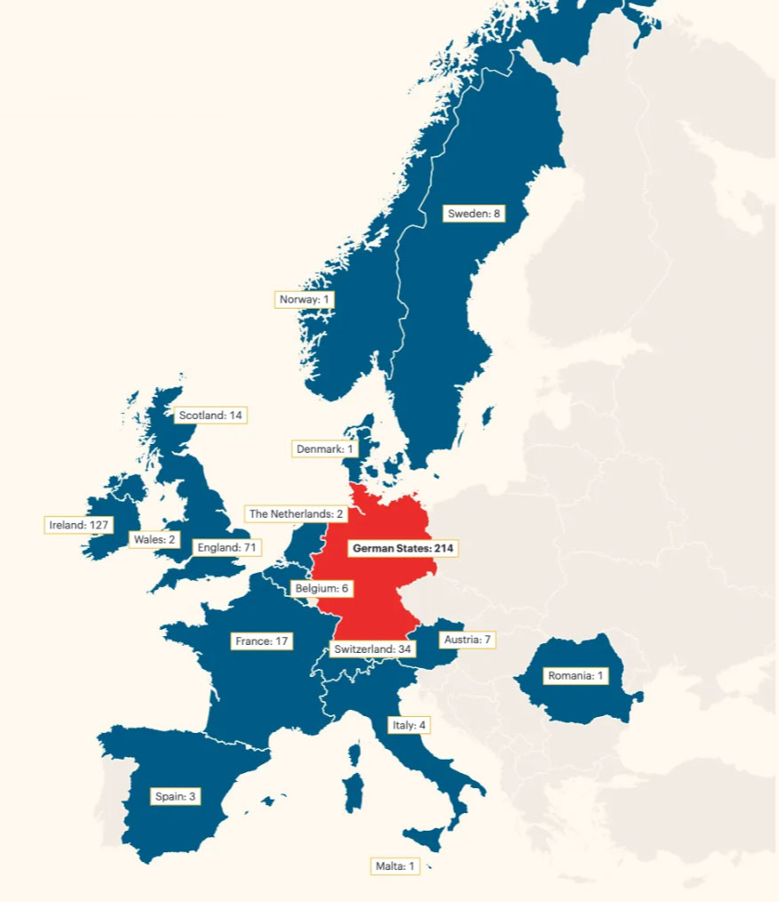 Distribution of dependents is shown above using a modern-day map of Europe.