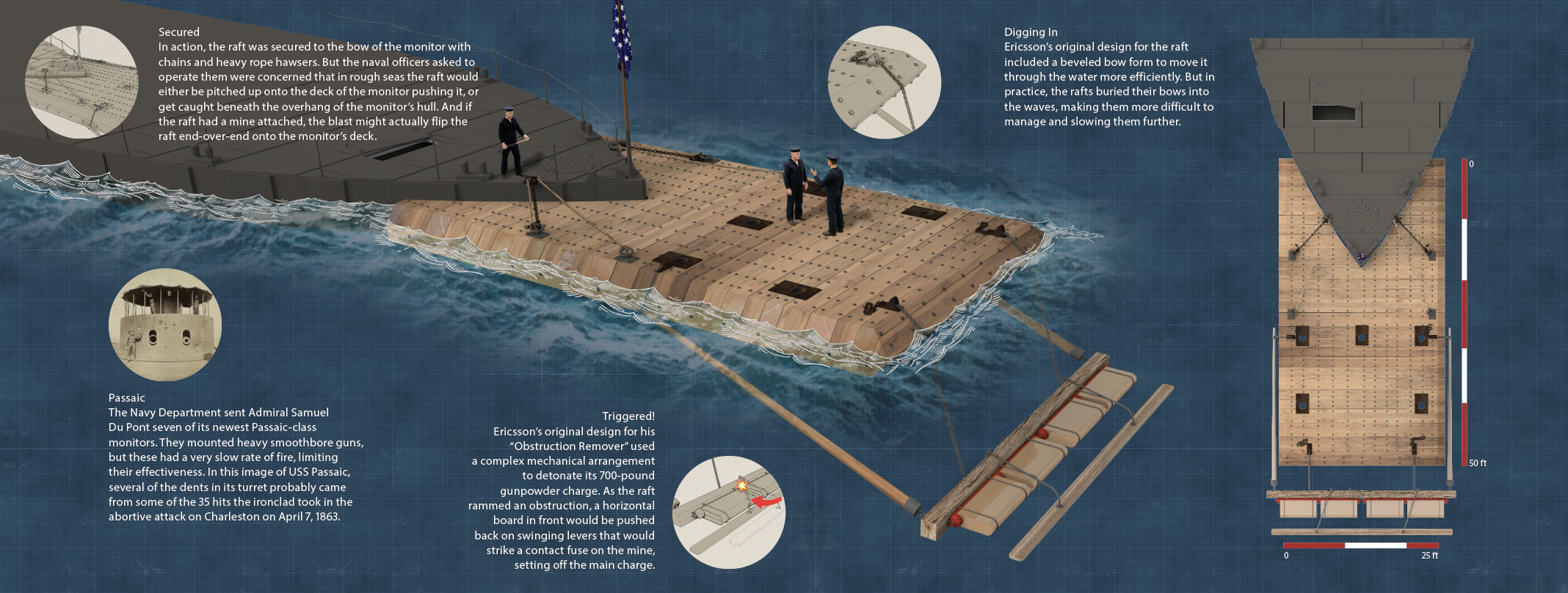 In the most notable change from his original concept, Ericsson fitted the bow of each raft with a horizontal boom that could be lowered in front, as if to sweep ahead of the raft. To this beam he affixed two cast iron cylinders, each 10 inches in diameter and 11 feet long, that spanned the entire width of the raft and boom. Each cylinder contained 350 pounds of powder that would be set off when a second, much lighter boom suspended from the first, contacted a hard surface, say a harbor obstruction. The momentum of the raft and the monitor behind it would swing the lighter boom back into the heavier one with the explosives attached, setting off contact fuses that would detonate the full 700 pounds of gunpowder. To direct the main force of the blast into the obstruction, Ericsson fitted the explosive cylinders with air chambers on their front side, which he believed would direct most of the blast forward, away from the raft and the ship behind it.8
