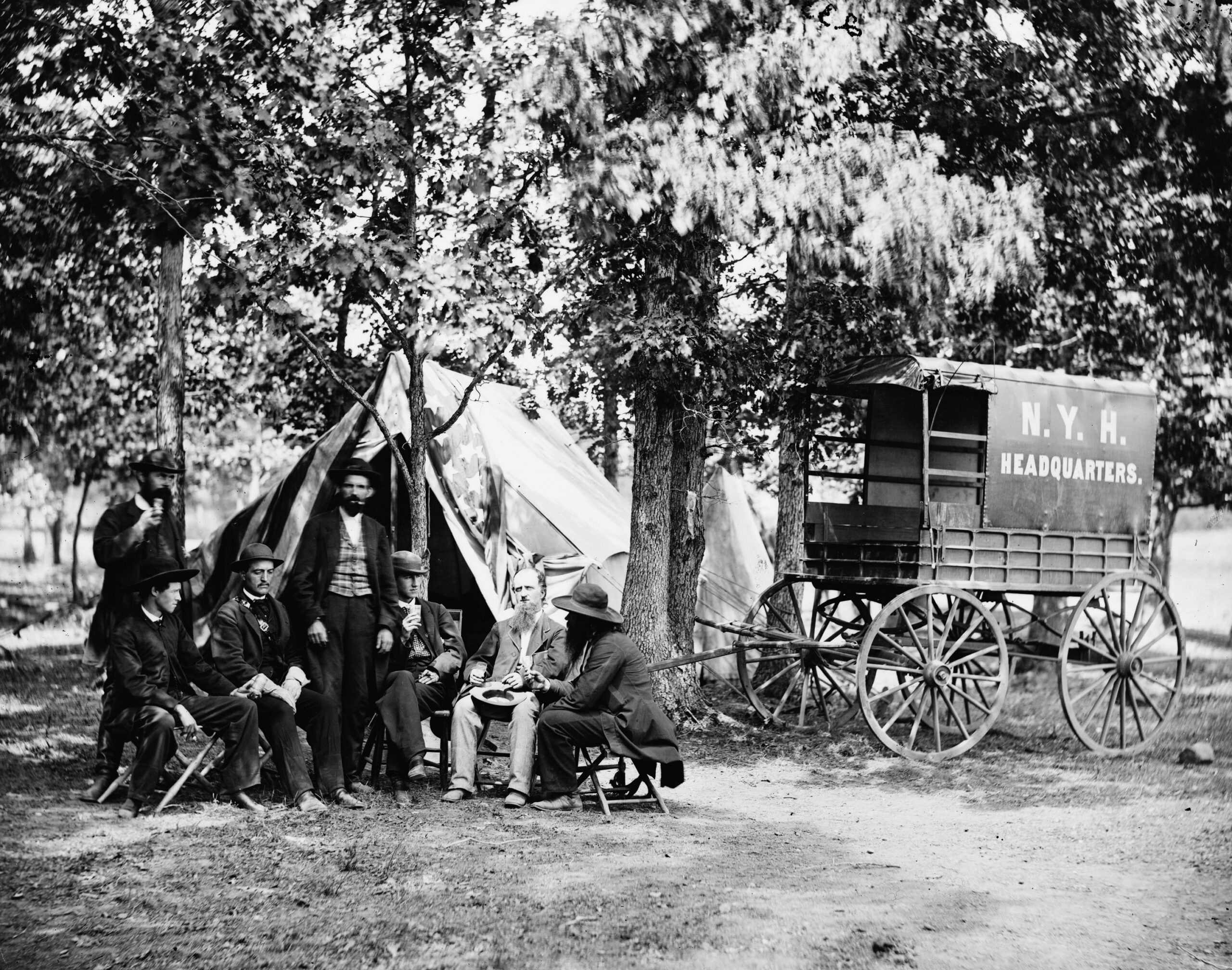 In this September 1863 image of war correspondents working for the New York Herald, Alexander Gardner makes a rare appearance in one of his studio’s images. Gardner, who had started working for Mathew Brady and now had his own studio—and his own fame—is seated at right. His face cannot be seen, but Gardner can be identified by his hat, his distinctive beard, and his hands and fingernails, which are blackened by the silver nitrate used in the process of preparing and developing glass plate negatives.