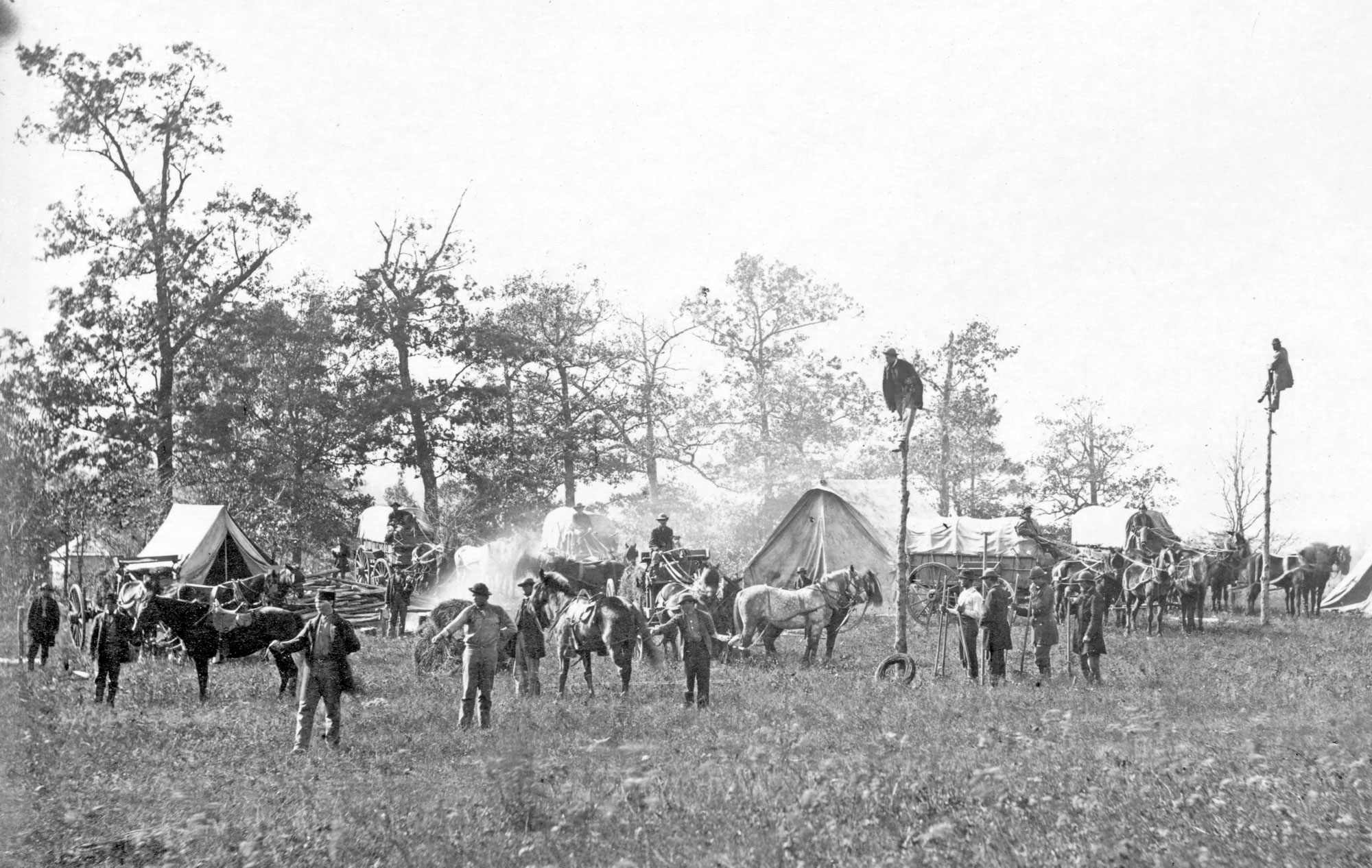 “It would be difficult to enumerate the hazards, vexations, and obstacles incident to the construction of military telegraph lines. The telegraph is ever at the front, occupying the post of danger and of honor…. Follow the army where you may, there also will you find the telegraph exercising its vigilance and its protection over the surrounding camps.” So wrote Anson Stager, superintendent of the U.S. Military Telegraph Corps, in his annual report to Quartermaster General Montgomery Meigs in 1863. Formed shortly after war broke out and staffed by civilians, the U.S. Military Telegraph Corps worked to provide speedy and clear communication between battlefront and homefront—in particular between commanders in the field and Washington, D.C.—using existing telegraph lines where available and creating new lines as required by Union forces moving through the southern states. (Above, operators are shown hanging wire in 1864; of the country’s prewar capacity of 50,000 miles of wire and 1,400 stations, some 10 percent was located in Confederate territory.) Operators’ jobs were demanding and, as Stager noted, perilous on the front lines. By war’s end, thousands of miles of line had been constructed by the corps, which one Union general claimed had been responsible for saving “thousands of lives and millions of treasure.” Shown here are statistics associated with U.S. Military Telegraph Corps operations.