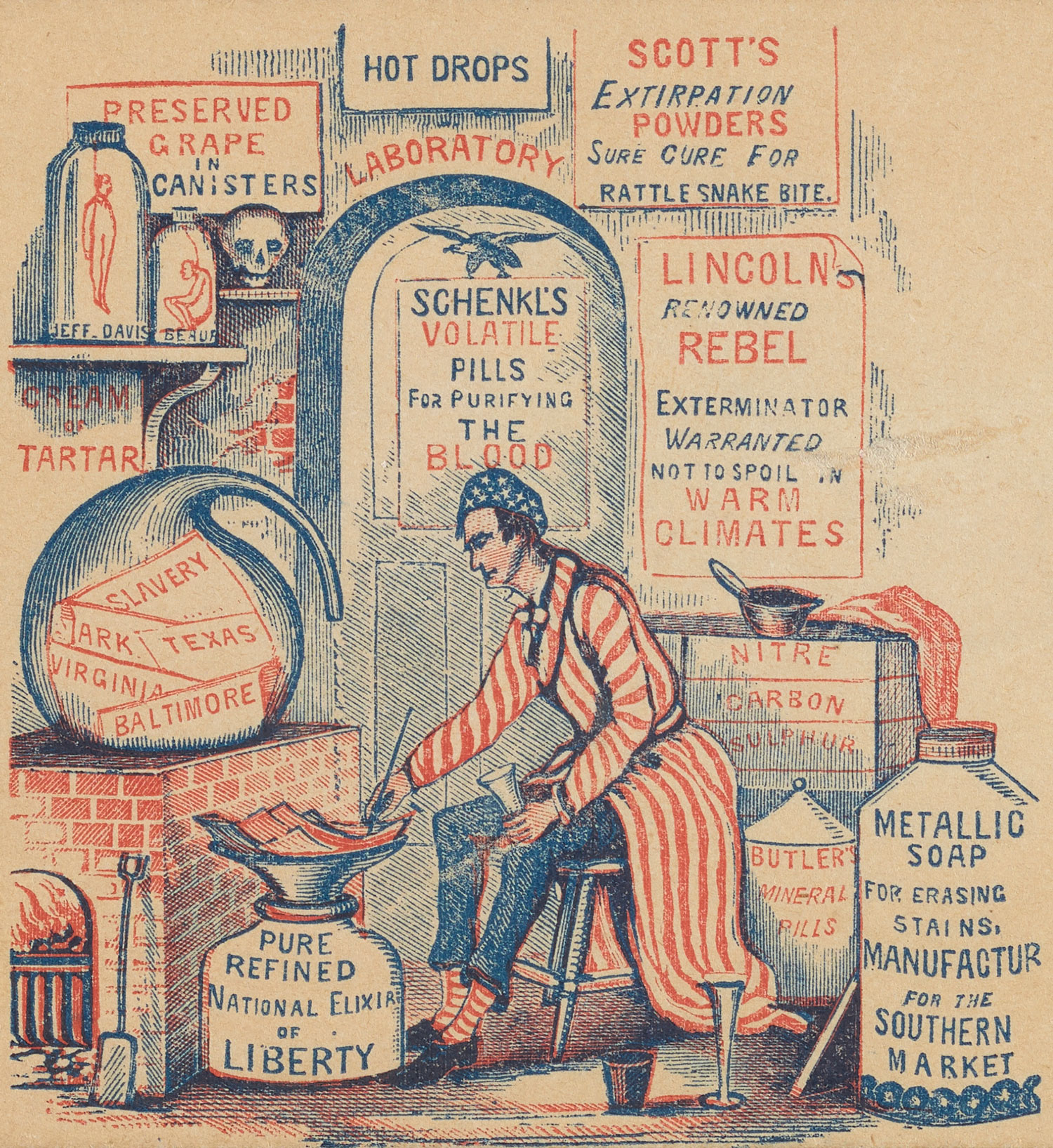 Sometime during the Civil War, G.M. Whipple & A.A. Smith, publishers in Salem, Massachusetts, produced envelopes (or covers) printed with this colorful illustration. It depicts Abraham Lincoln, dressed in a patriotic cap and robe, as an apothecary seated in front of a pot labeled “Pure Refined National Elixir of Liberty” and surrounded by advertisements for his pro-Union concoctions, including “Scott’s Extirpation Powders” (named after General-in-Chief Winfield Scott) and “Butler’s Mineral Pills” (a nod to Major General Benjamin F. Butler). Miniatures of prominent Confederates Jefferson Davis and P.G.T. Beauregard hang in specimen bottles on a nearby shelf. While thousands of unique patriotic covers were produced in the North during the conflict, few could boast the detail and creativity of this Whipple & Smith production.