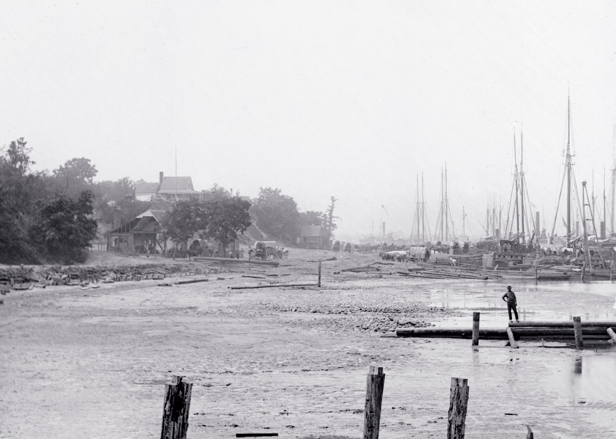 The improvements and management systems had yet to cope with the increasing traffic on the day Lincoln arrived. A New York Herald reporter noted at the time that “the James was covered with vessels and transports which had followed the army with supplies.”8 Baltimore, with no cargo to unload and its special passenger unannounced, probably halted just offshore to allow the president to board a rowboat at about 9 a.m. on June 21. When he came ashore he would have seen large numbers of laborers (white and black) building additional wharves, along with growing mounds of quartermaster’s and commissary stores awaiting distribution.9 Lincoln forged ahead of the others (Assistant Secretary Fox with Tad in tow, plus Colonel Chadwick) and probably headed up the nearest roadway (modern Pecan Avenue) leading toward Grant’s headquarters, which was clearly marked with a large U.S. flag.
