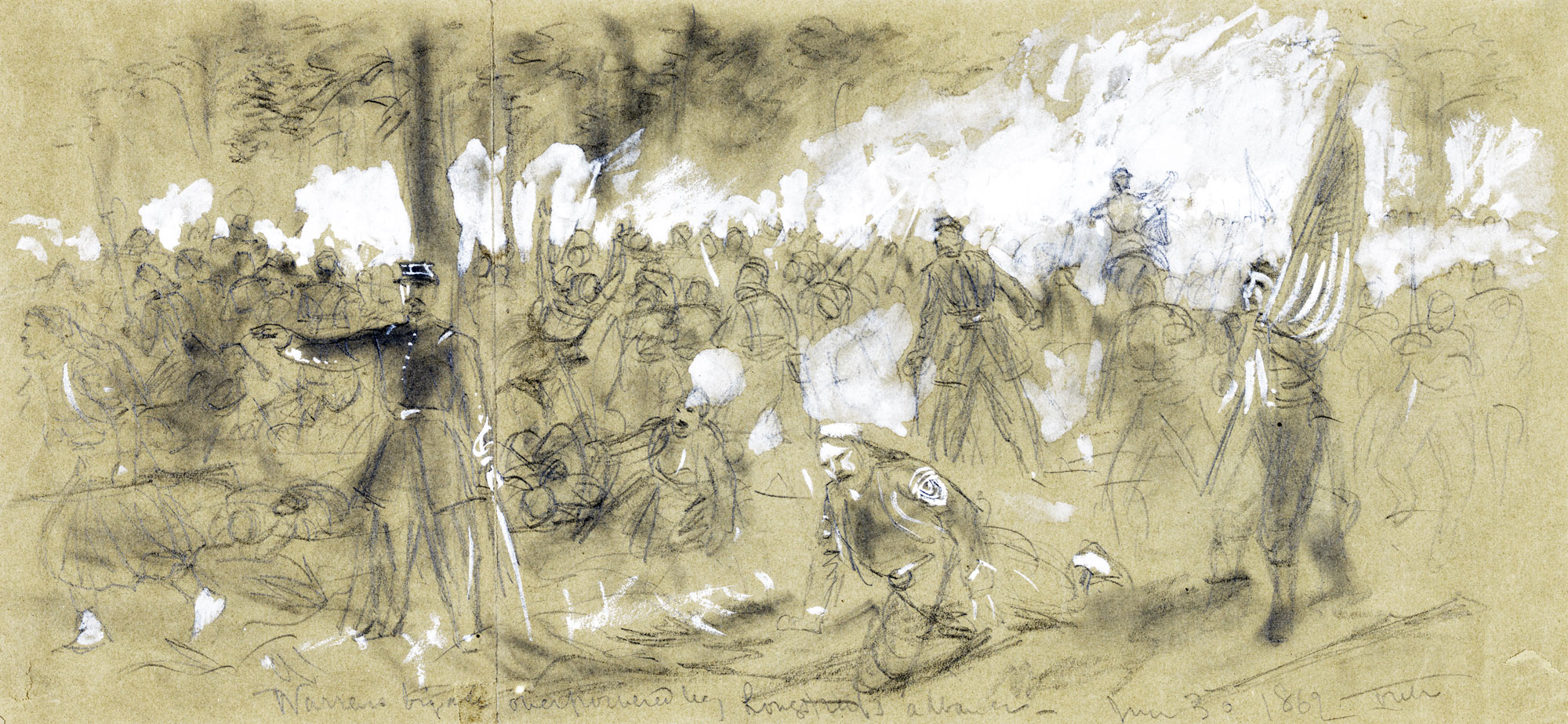 Library of CongressIn this sketch by Edwin Forbes, Union soldiers fire on the advancing troops of James Longstreet’s corps of the Army of Northern Virginia on August 30, 1862, the second day of the Battle of Second Manassas.