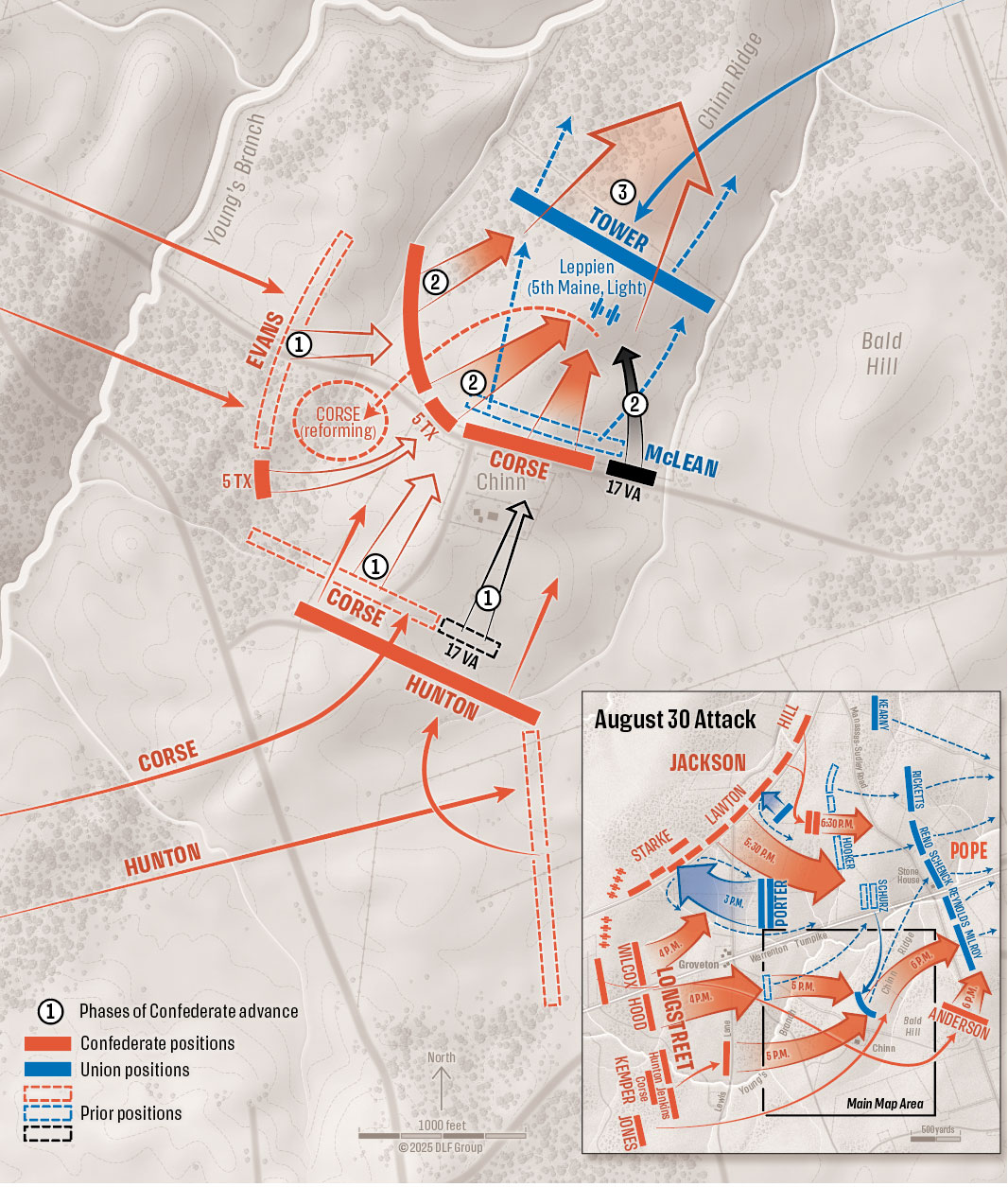 Battle of Second Manassas – Manassas, Virginia – August 30, 1862 – At about 4 p.m. on the second day of the Battle of Second Manassas, James Longstreet launched his corps against the weakened left flank of John Pope’s Union army. Among the attacking Confederates were Alexander Hunter and his 17th Virginia Infantry, positioned on the extreme right of Montgomery D. Corse’s brigade. Supported by Eppa Hunton’s Virginians, Corse’s men focused their assault on the Union position on Chinn Ridge (1). Once past the Chinn House, these Confederates—supported on their left by Nathan G. Evans’ brigade and the 5th Texas Infantry—attacked and overwhelmed the guns of George F. Leppien’s 5th Maine Light Artillery (2). In the confusion of battle, Hunter became separated from the 17th Virginia (which had pulled back to regroup), first joining the Texans’ advance, then falling in with men from the 20th Georgia Infantry. A final Confederate push (3) sent Pope’s army into retreat toward Washington.