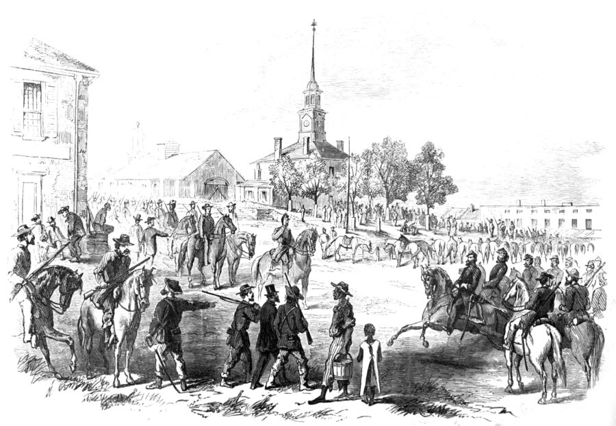 Frank Leslie’s Illustrated NewspaperCarrington, charged in 1863 with organizing Indiana’s militia in response to a raid by John Hunt Morgan’s Confederate calvary (depicted in this illustration from Frank Leslie’s Illustrated Newspaper), delayed in taking three regiments to try to cut off morgan’s men, having first stopped at a rail depot for some alcoholic “refreshments.”