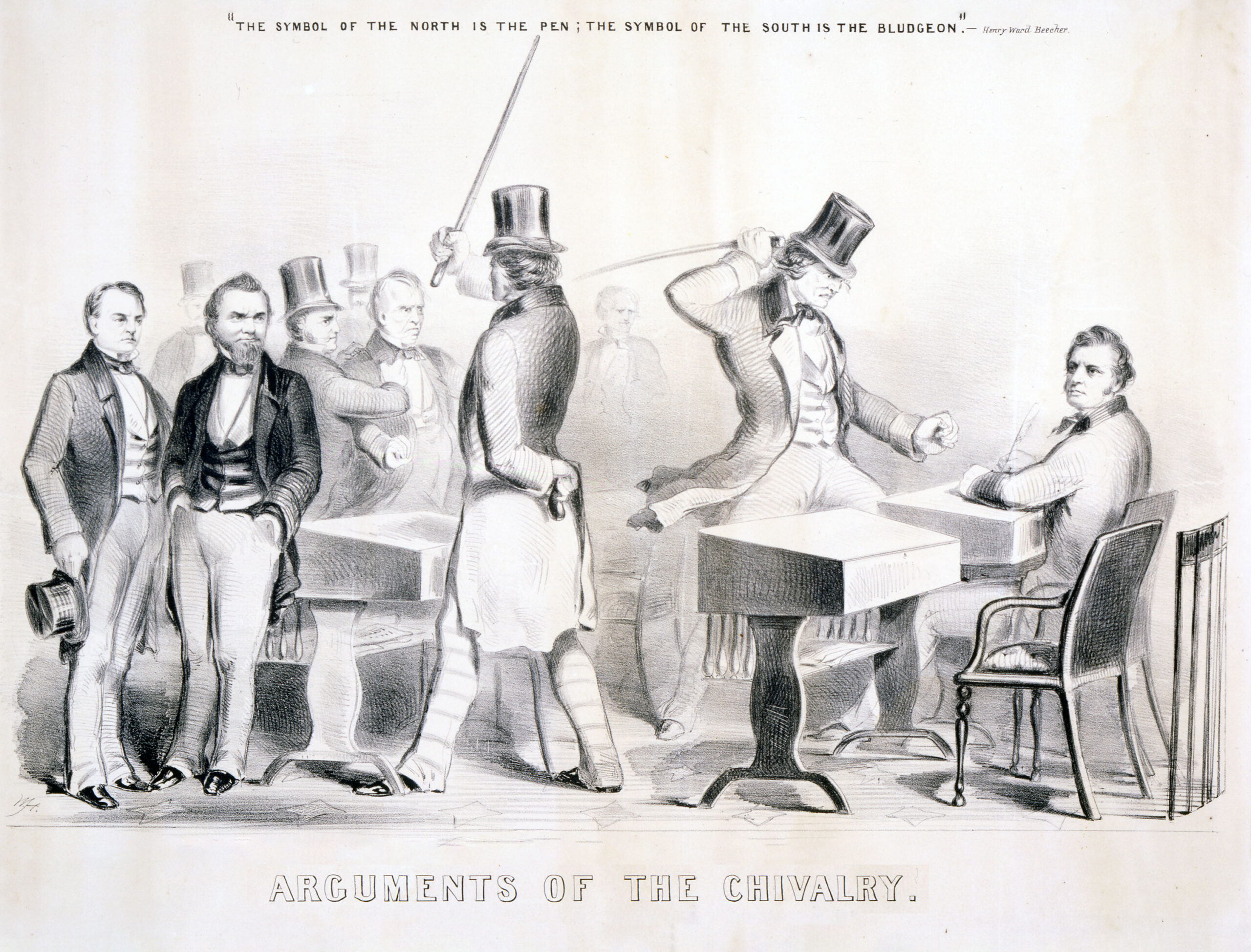 Library of Congress Reactions to Brooks’ assault on Sumner broke down largely along sectional lines, with southerners generally offering words of support and encouragement and northerners voicing outrage and disdain. Among the latter expressions was Winslow Homer’s lithographic depiction of the attack titled “Arguments of the Chivalry” (above).