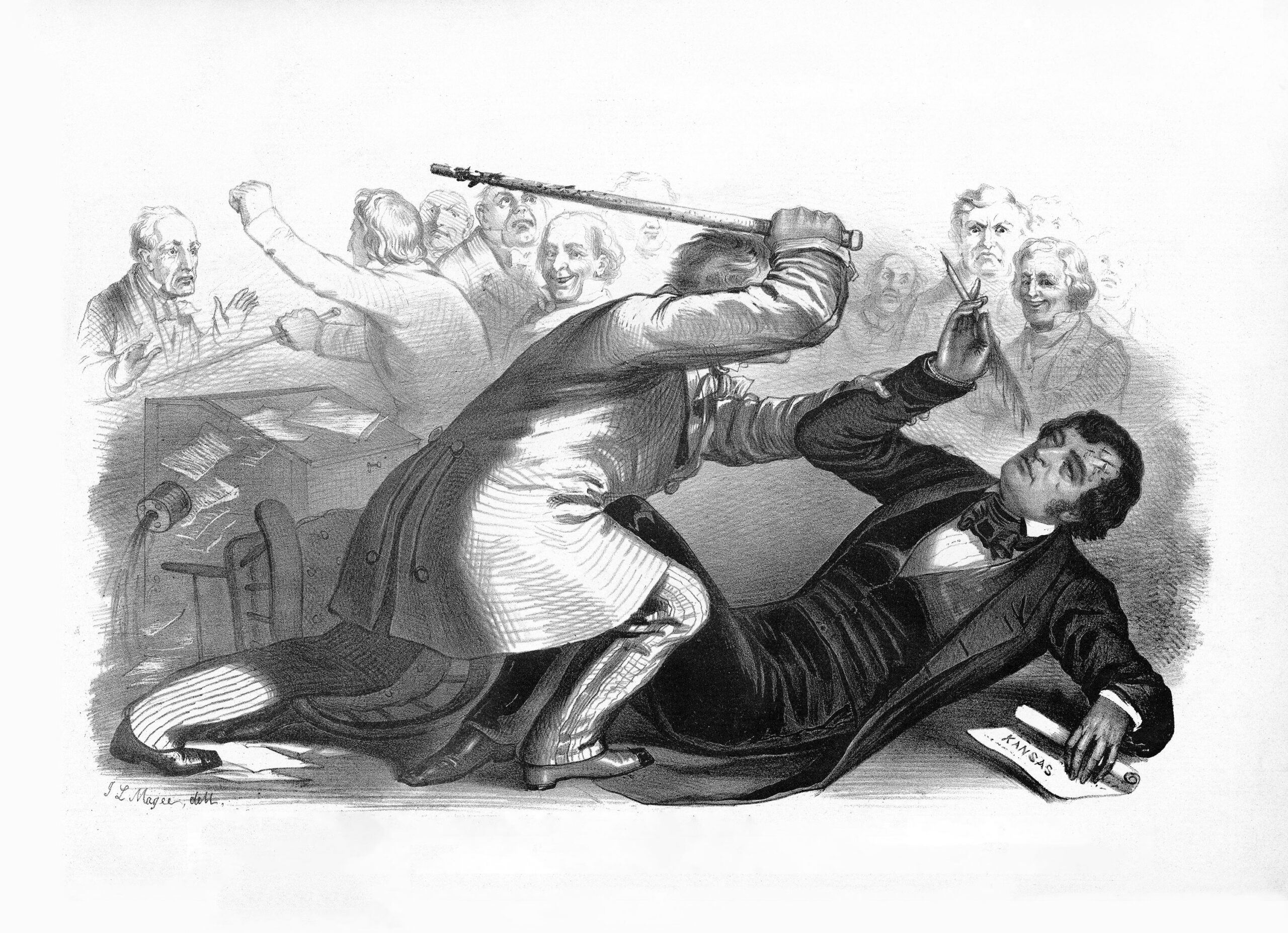 National Museum of American HistoryThis illustration by John L. Magee depicts the assault on U.S. Senator Charles Sumner of Massachusetts by Congressman Preston Brooks of South Carolina on the Senate floor on May 22, 1856, days after Sumner had delivered his “Crime Against Kansas” speech, in which he condemned the tactics of pro-slavery supporters in the territory.