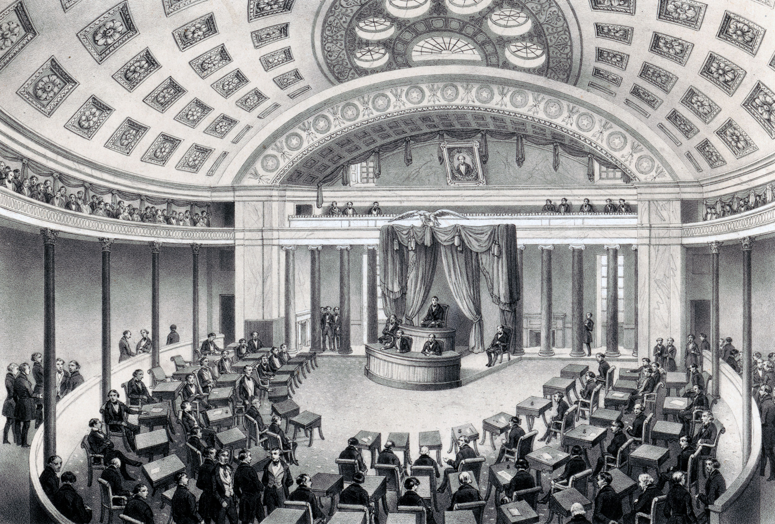 The Senate chamber reflected the majesty of the U.S. Congress. A semicircle 75 feet long and 50 feet wide, it was topped by an ornately carved half-dome ceiling and lit from above by skylights. The floor was carpeted in blood red, there were masses of gold-accented crimson drapes and rows of lustrous mahogany desks and chairs, with marble columns on one side and cast-iron pillars on the other. A golden carving of a mighty eagle perched on a shield and Rembrandt Peale’s portrait of George Washington looked over the resplendent space, proudly conveying the decorum and authority of the U.S. Senate.