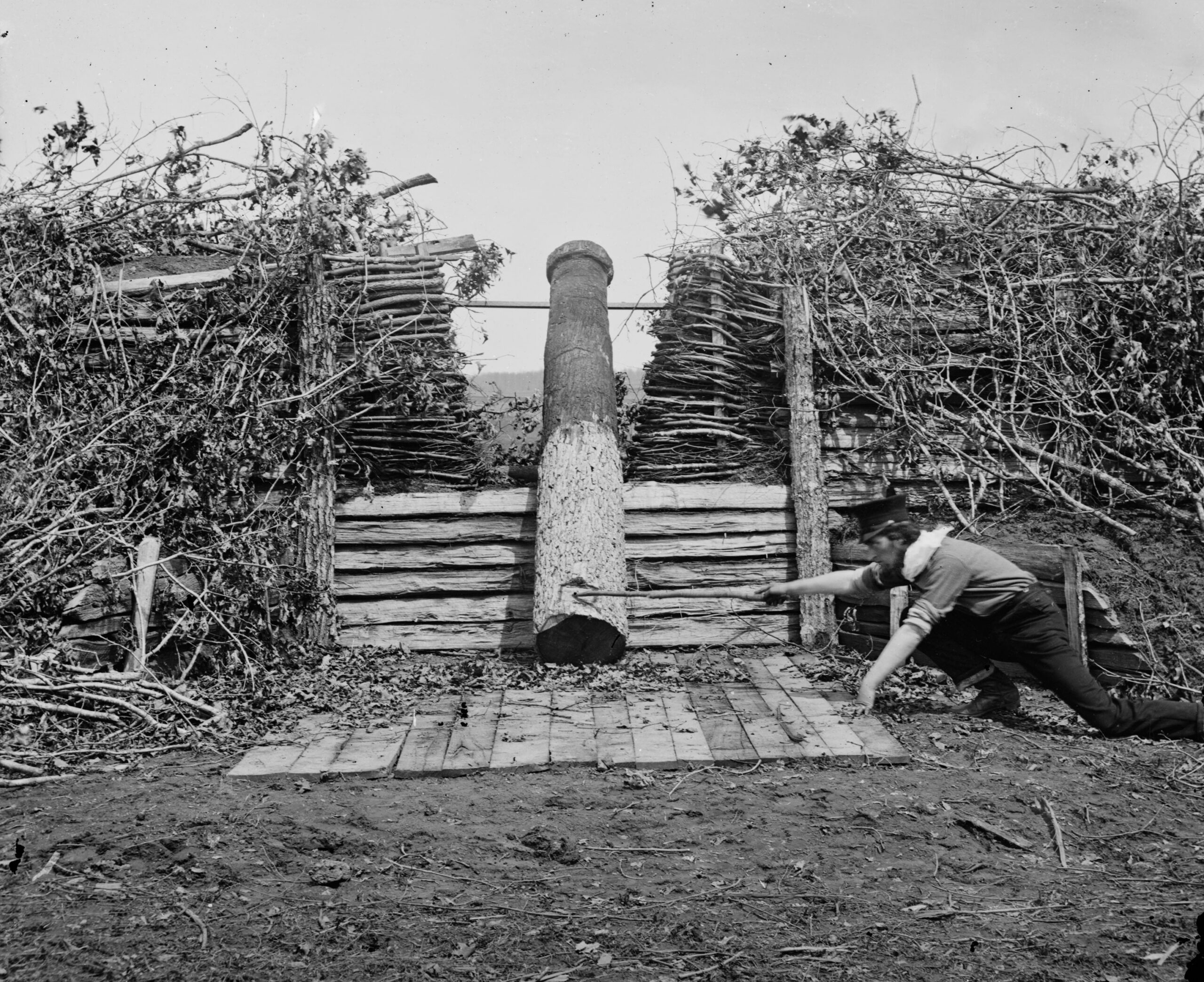 Library of CongressA man pretends to fire a faux cannon devised from a wooden log found in abandoned Confederate defensive works at Centreville, Virginia, in March 1862. Such so-called “Quaker guns” were employed by Confederates there and at Yorktown to fool Union general George B. McClellan into believing he faced a better-equipped and more-fortified enemy, thereby slowing his advance toward Richmond.