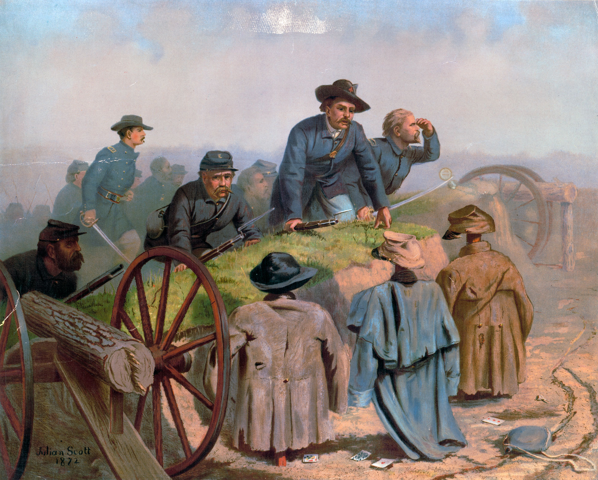 Library of CongressThis Julian Scott painting depicts Union soldiers discovering dummy defenders and Quaker guns in an abandoned Confederate earthwork.