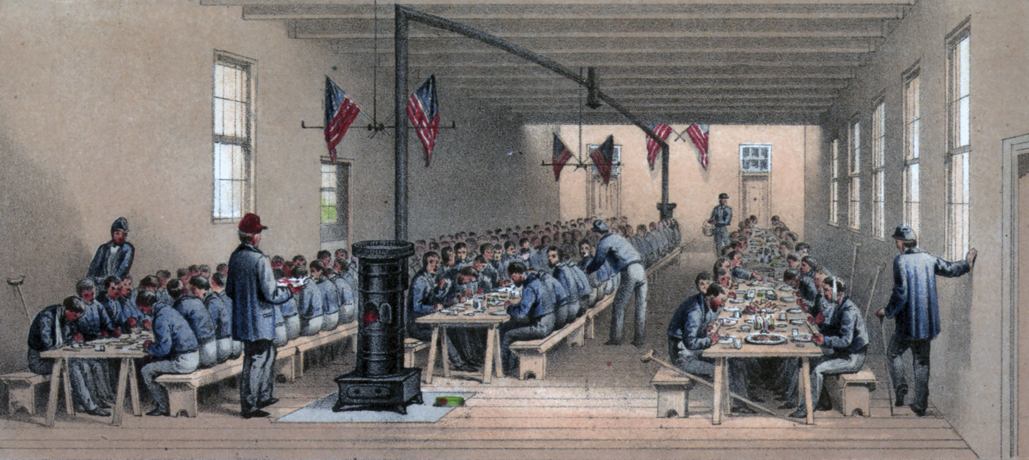 Illustration of Union soldiers in the mess hall.