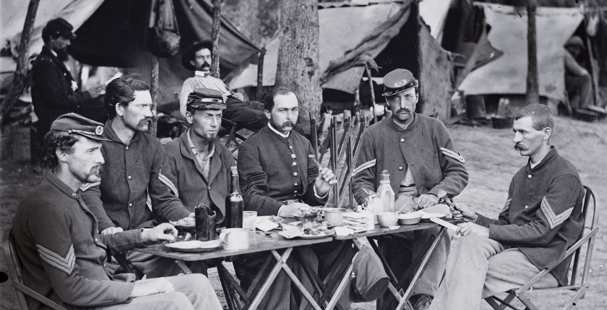 Library of CongressA group of soldiers sits down for a meal in camp