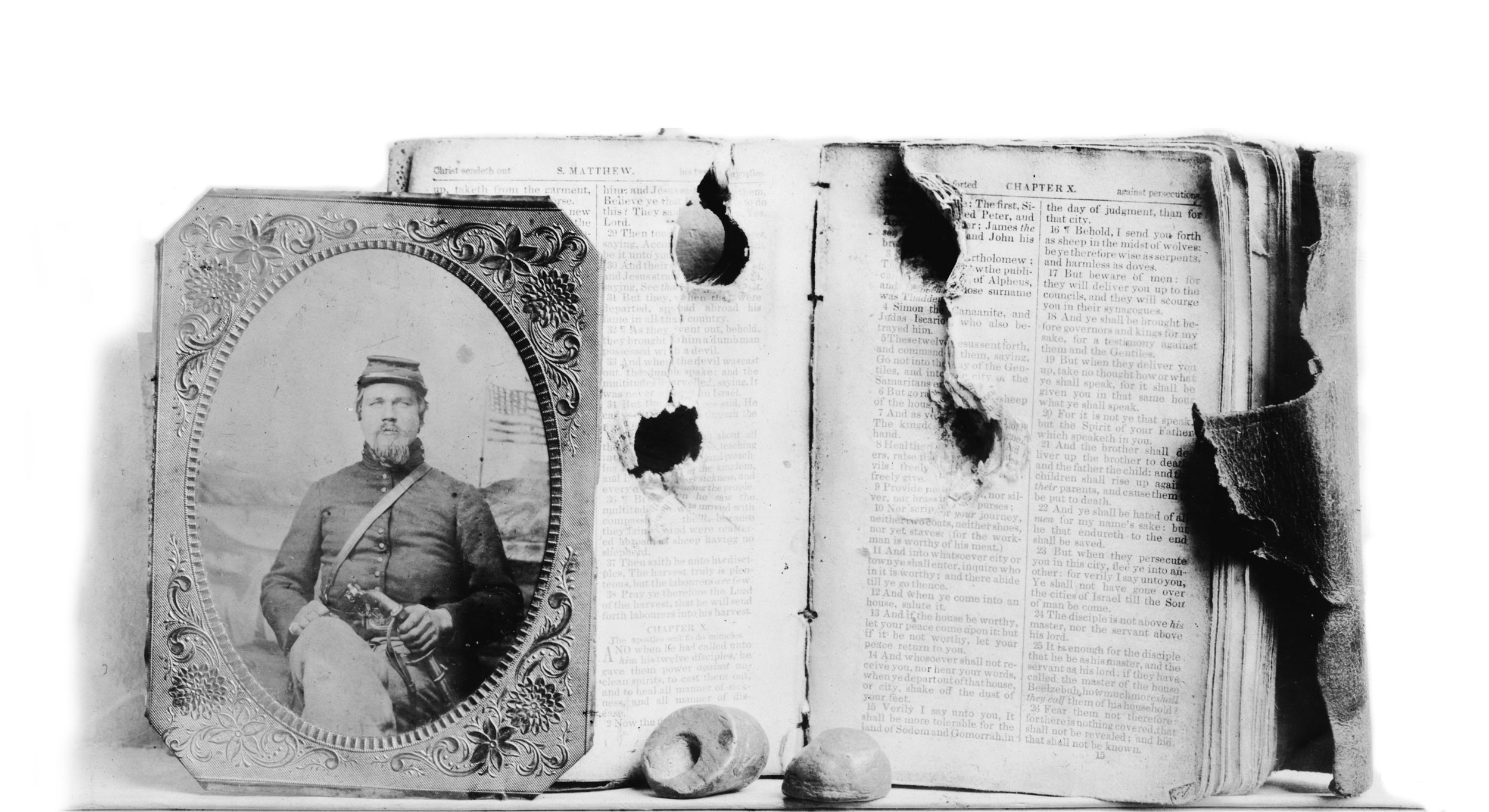 Like many Civil War soldiers, Walter Jones, a private in the 8th New York Cavalry, carried a small Bible in his uniform pocket for spiritual support. Little could he have imagined that the book meant to save his soul would save his flesh from potentially grievous injury—twice. In the fighting at Cedar Creek on October 19, 1864, a Confederate bullet hit Jones in the chest and was embedded near the top of the book. The same thing happened at the Battle of Appomattox in April 1865, this time the bullet piercing the damaged Bible dead center. The “little Testament … saved my life from bullets,” a grateful Jones said later. As evidenced by the above photo, Jones (pictured here in his uniform) kept not only the Bible but also the bullets as mementos.