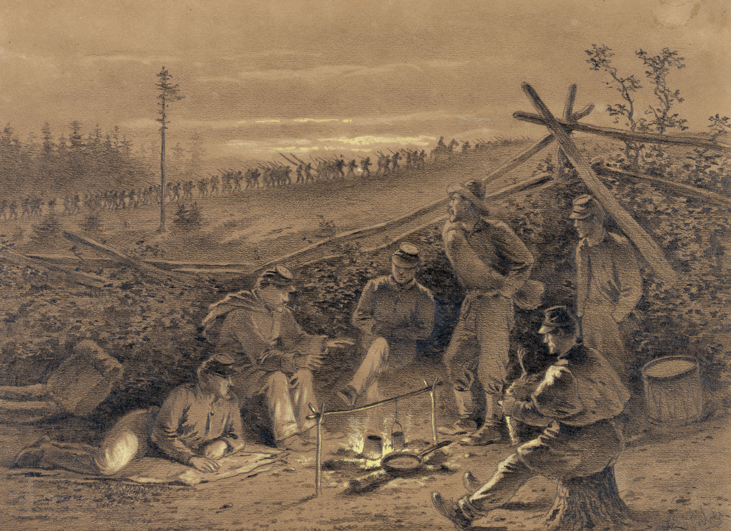Civil War soldiers gathered around a small campfire.