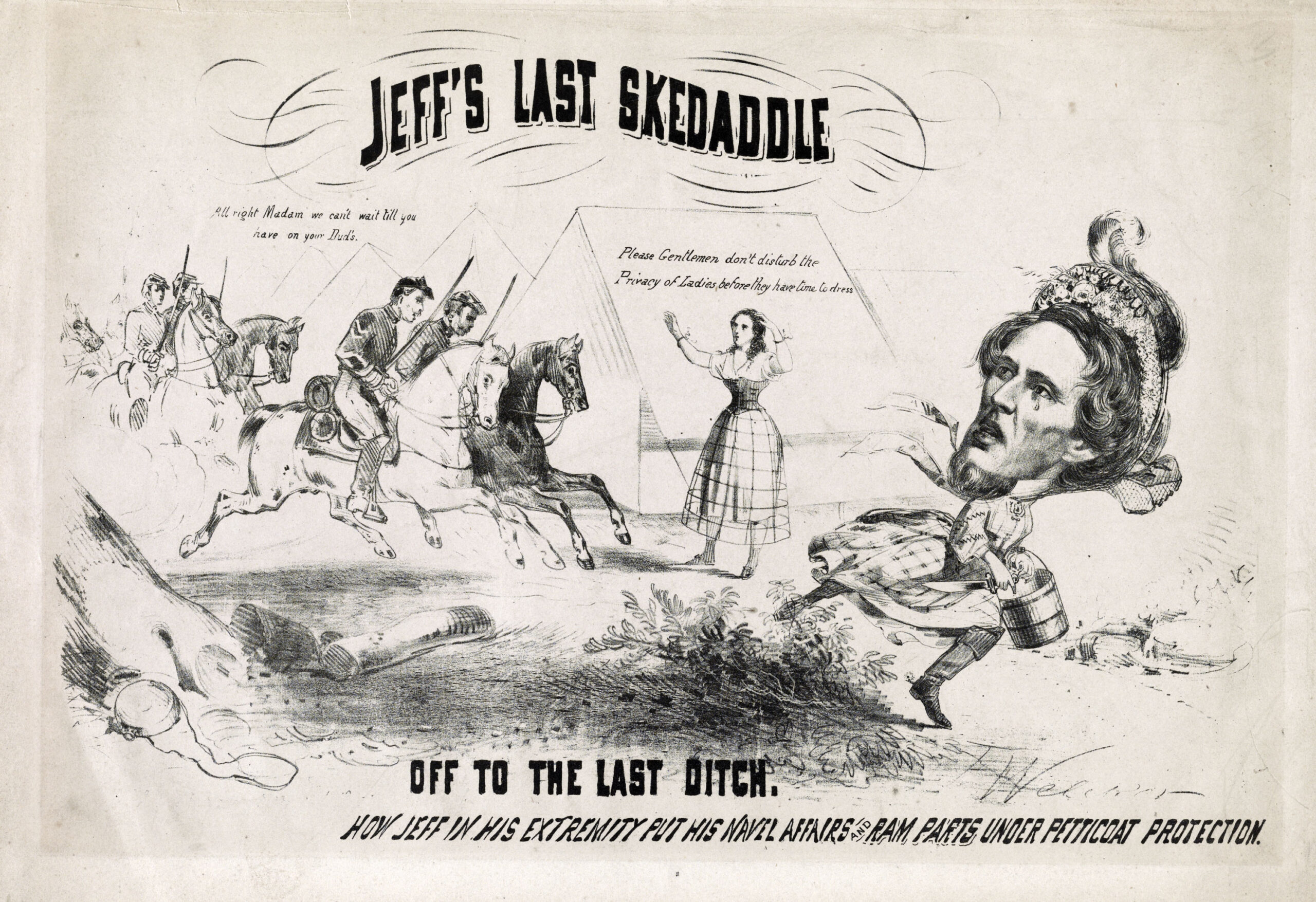 Library of CongressIn this 1865 cartoon by artist F. Welcker titled “Jeff’s Last Skedaddle,” Confederate president Jefferson Davis attempts to avoid capture by Union troops as his wife looks on. By war’s end, skedaddle had become a word used to describe retreats of various kinds.