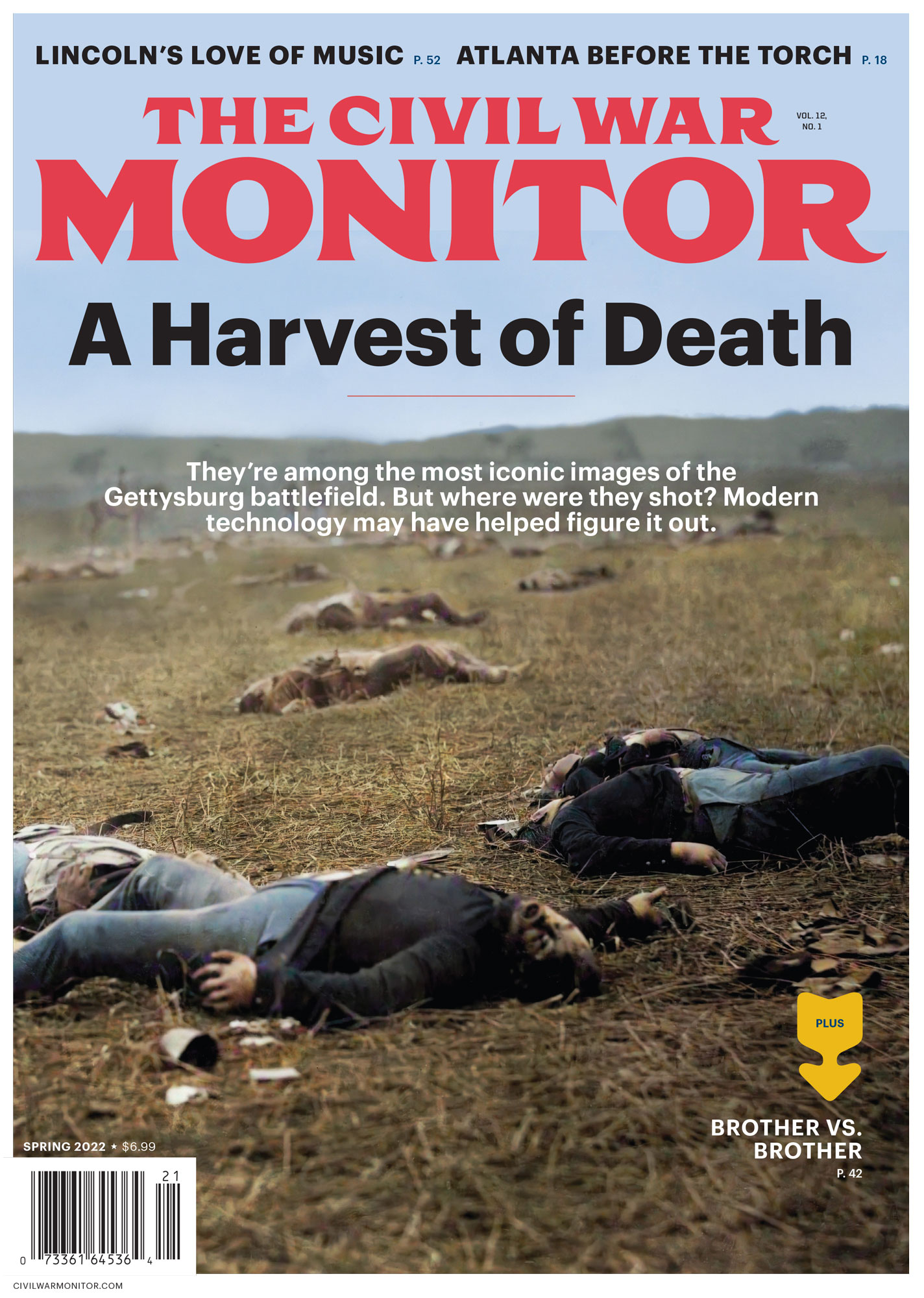 The Civil War Monitor’s Spring issue caught my eye at a local grocery store from the familiar photo on the front (I’m glad to see more and more Civil War photos being colorized). Patrick Brennan’s article really hit home with me due to the fact I had read William Frassanito’s Gettysburg: A Journey in Time. And Civil War photos have always been a favorite of mine. (Too bad the History Channel’s Battlefield Detectives is not still airing; this would have made a great episode.) I have since become a subscriber to the magazine and have purchased the Gettysburg burial map, things I’ve been wanting to do for a long time. So thank you and keep up the great work.