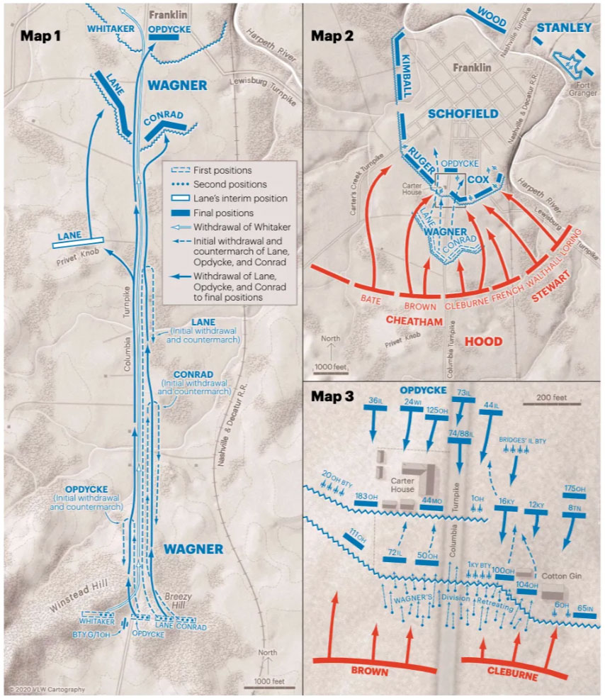 VLW CartographyThe Battle of Franklin: Franklin, Tennessee | November 30, 1864. Withdrawing toward Franklin on the morning of November 30, 1864, the rearguard of John M. Schofield’s Union force—commanded by George D. Wagner and consisting of the brigades of Walter C. Whitaker, John Q. Lane, Joseph Conrad, and Emerson Opdycke—withdrew from its positions on Winstead and Breezy hills only to be ordered to return, minus Whitaker (Map 1). Advancing Confederates soon pushed them back toward Franklin; Opdycke withdrew into town while Lane and Conrad eventually settled into a position south of the main Union line. The resulting battle saw Lane and Conrad driven back into Franklin (Map 2); a key advance by Opdycke would help turn back the Rebel breakthrough near the Carter House (Map 3).