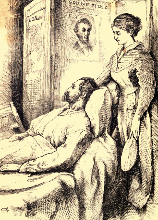 Hospital Sketches (1885)Among the more moving episodes in Hospital Sketches, Alcott’s account of her time as a nurse, was her interaction with a patient named John, who had been seriously wounded at Fredericksburg. Above: Alcott tends to John in an illustration from an 1885 edition of Hospital Sketches.
