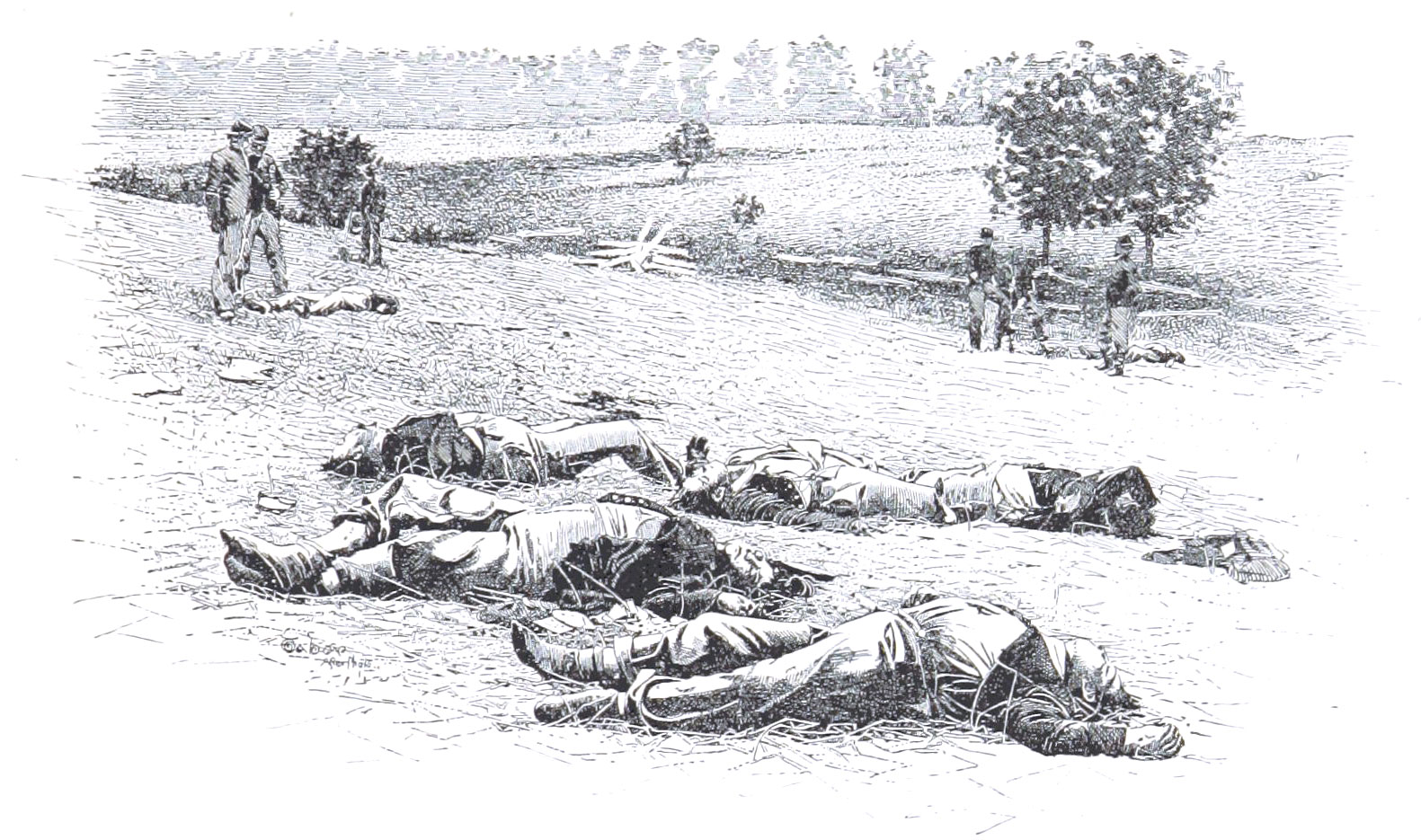“All over the field were scattered black and bloated corpses of men and dead horses…. I was galloping along the road when … my horse sprang to one side, and looking to see what started him, I saw the bodies of thirteen rebels lying in the mud with the pitiless rain beating on their ghastly faces. That would have been a horror at home; there it was only a glimpse of what might be seen.”