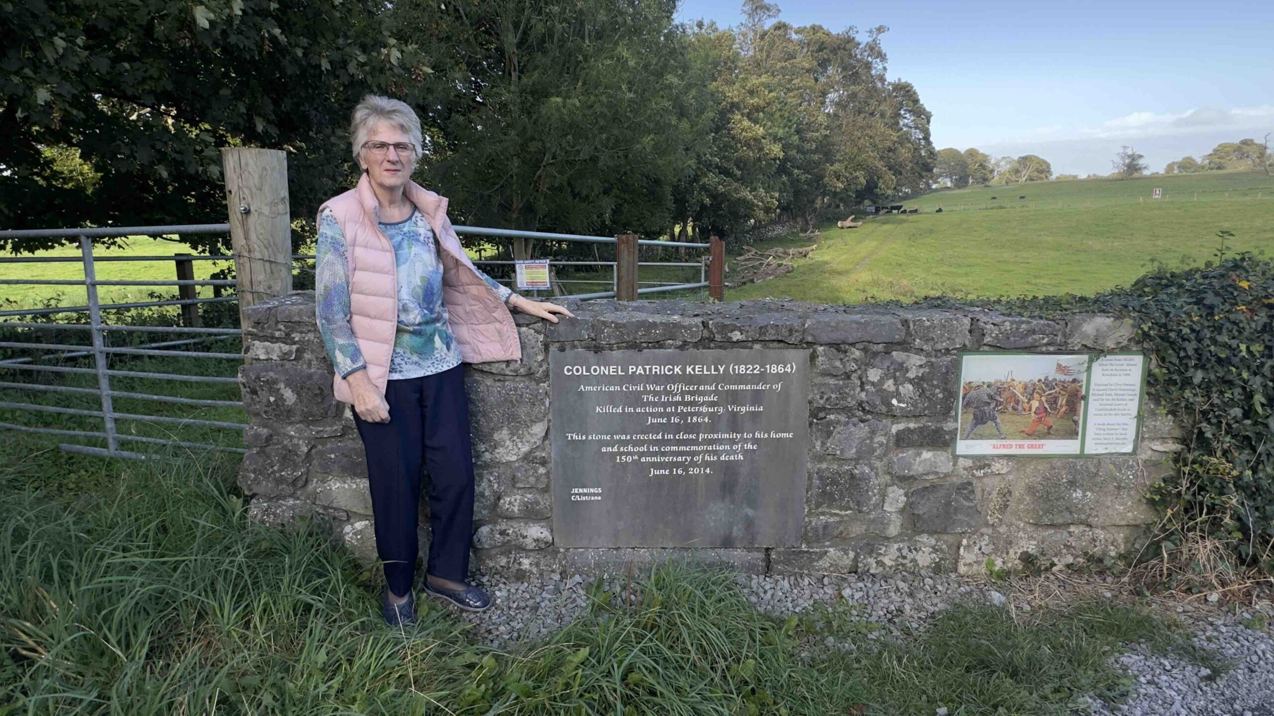 Invigorated by our good fortune, we follow McHugh to a stone that bears an inscription she commissioned for Kelly. She tells us how he led his men at Antietam and elsewhere before a bullet ended his life at Petersburg on June 16, 1864. McHugh researched his story, including by visiting the United States, and convinced a farmer to allow the stone’s placement.