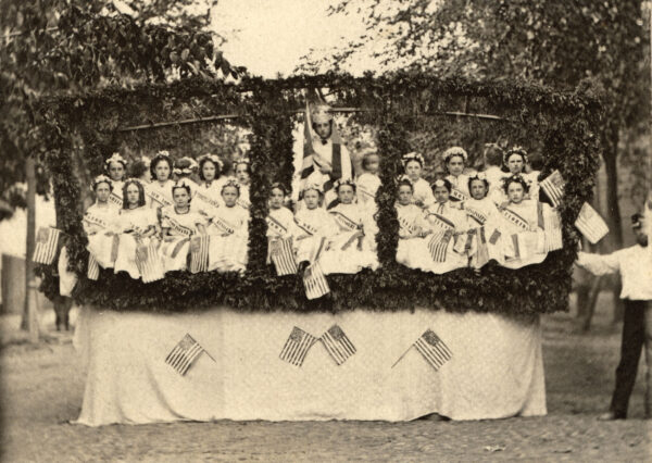 A groups of young girls display their patriotism in a photo made during the Civil War.