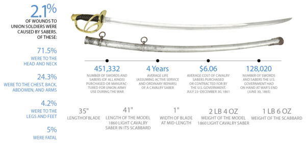 Facts and figures associated with Civil War cavalry sabers, in particular the Model 1860 Light Cavalry Saber, the type most commonly used by Union and Confederate soldiers.