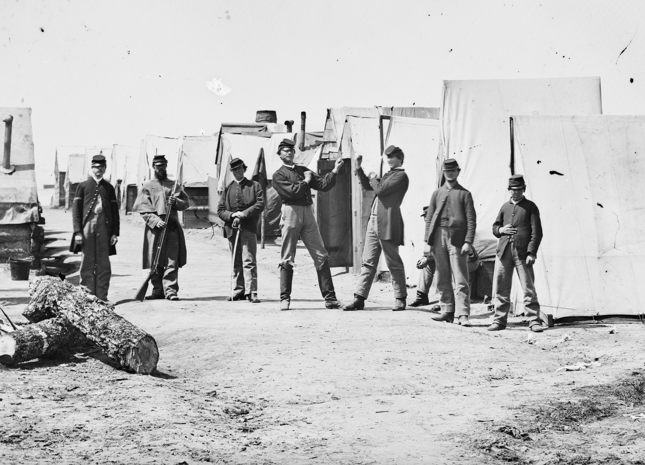 In this photo from 1861, a surgeon stands among soldiers of the 74th New York Infantry as he performs a (presumably staged) amputation outside the surgeon’s tent at Union army camp near Washington, D.C.