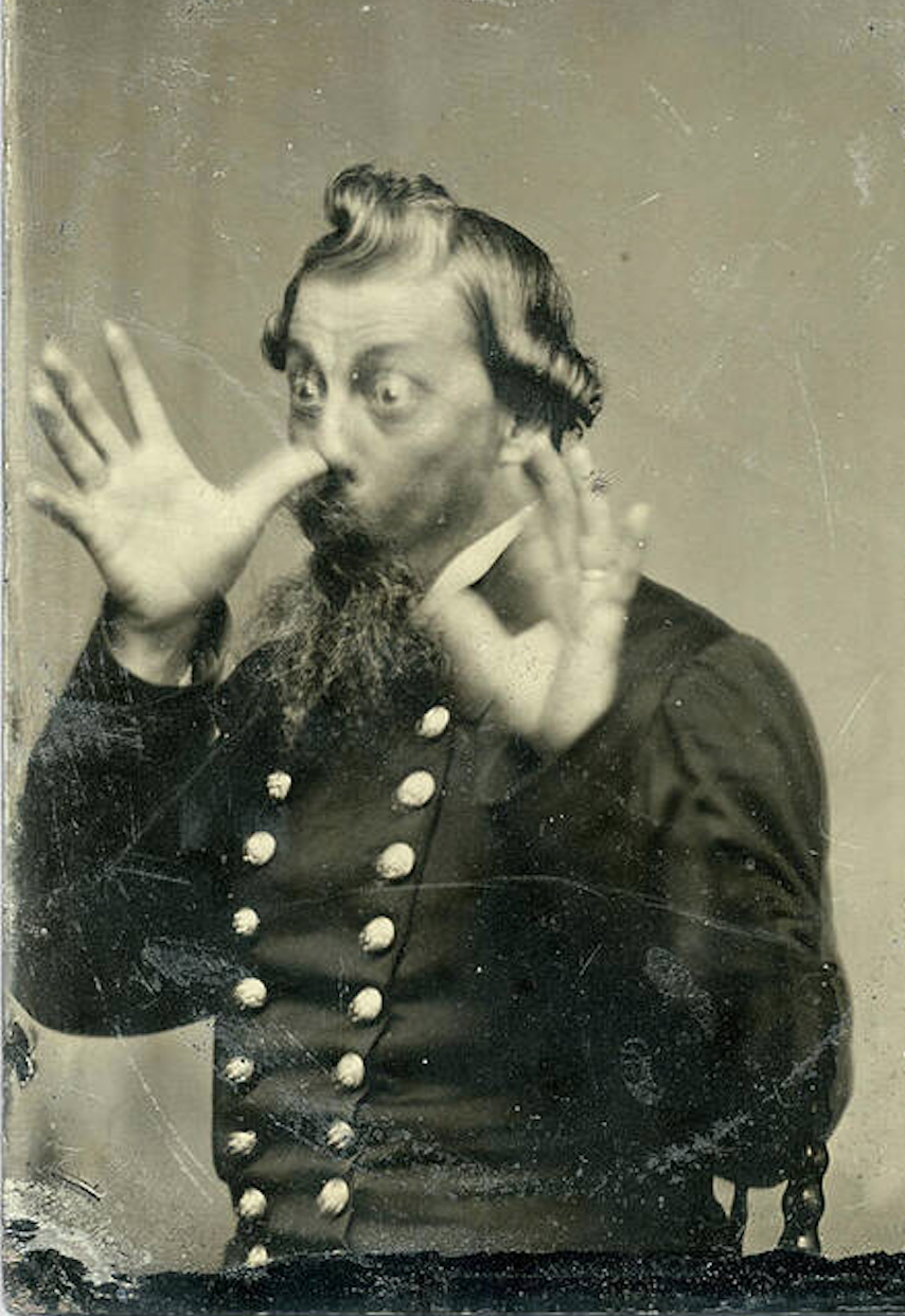 An oddly coiffed Union officer “puts thumb to nose,” flashing the time-honored gesture of derision. (Image courtesy of Ronald S. Coddington)