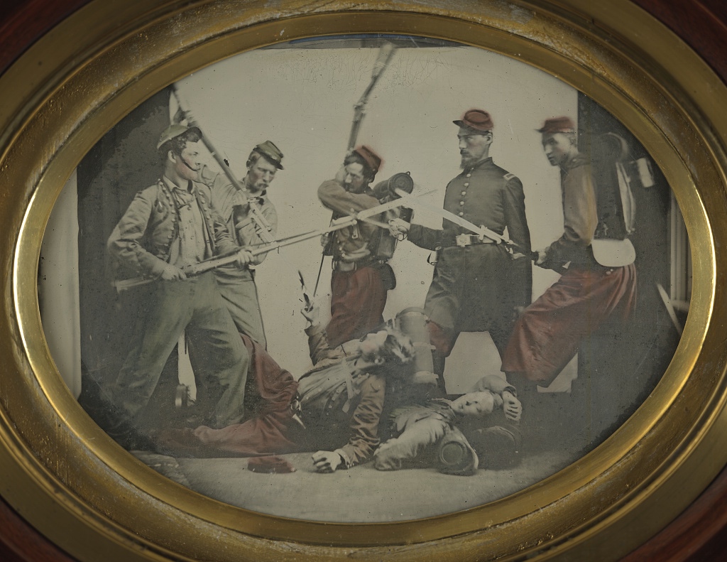 Unlike the recumbent soldier above, these Zouave troops opted for a much more martial pose in the photographer’s studio, play-acting a combat scene for the camera.
