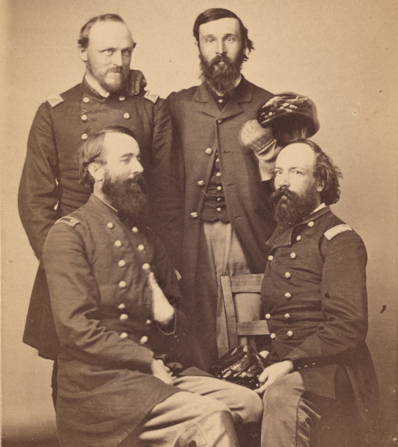 Is Brigadier General Edward Follansbee Noyes (in back at right) lifting the hat off the head of Major General John Wallace Fuller (front right) … or is Noyes simply holding his own hat? The hat in Fuller’s lap seems to point to the latter scenario.