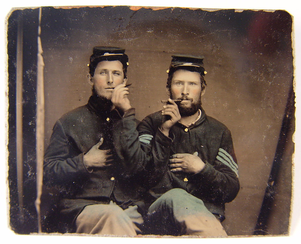 These Union soldiers demonstrated their fondness for tobacco, and each other, in a single pose.