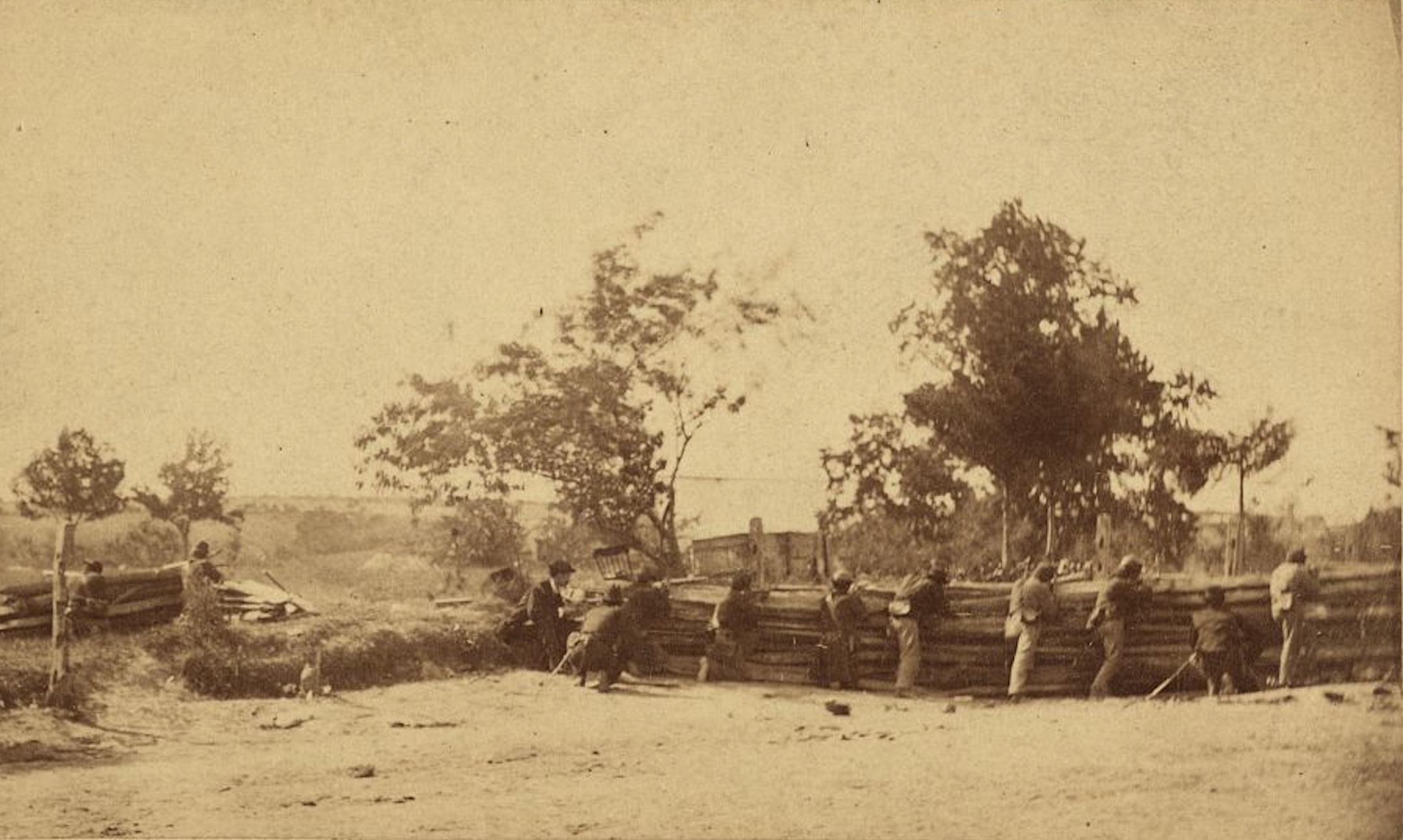 Union soldiers, some of whom appear to be amputees, pose in a firing line for the benefit of the photographer. Note the civilian, who appears to be a sketch artist, at center-left.