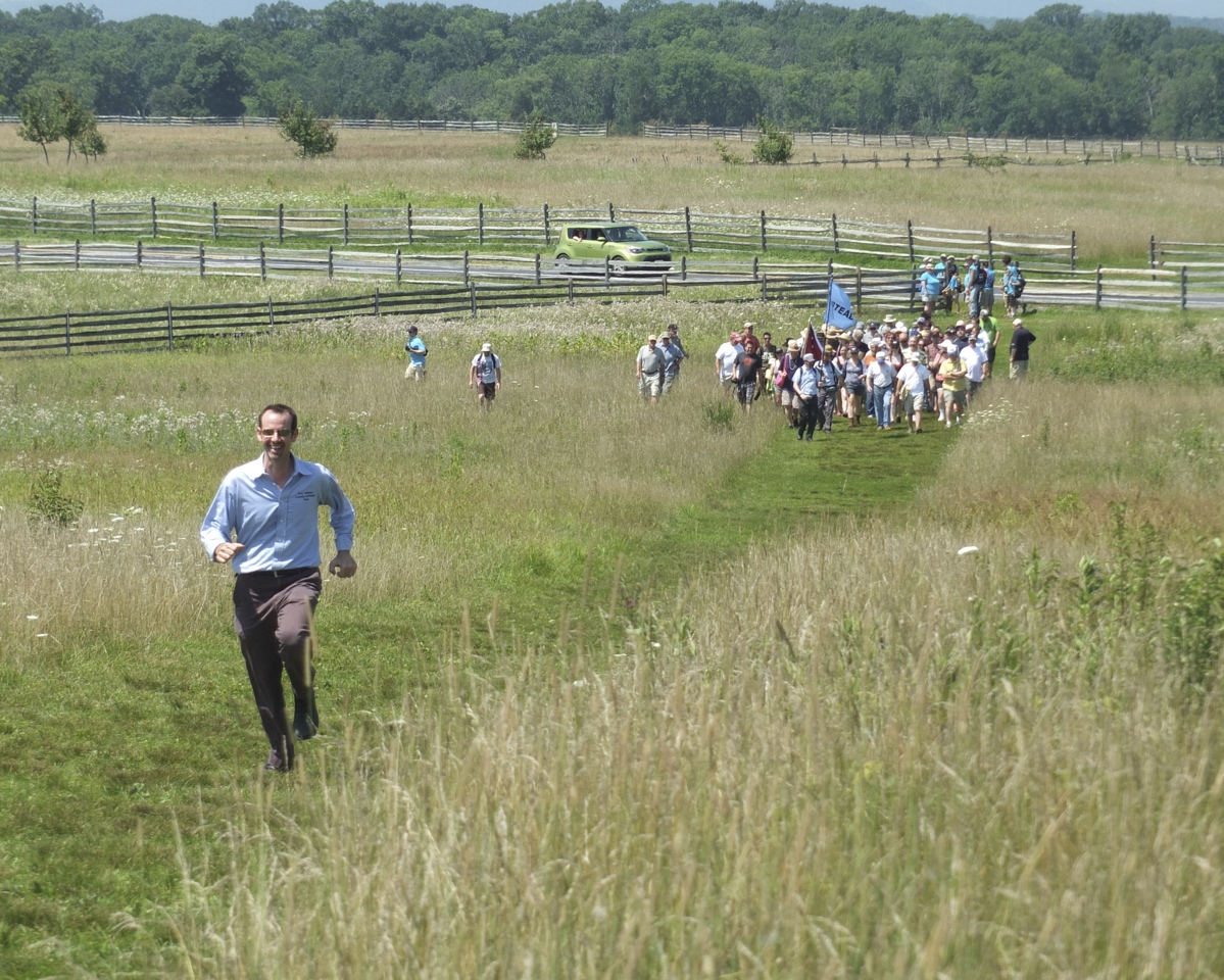 Bruce GuthrieGarry Adelman charges ahead of his group during a battlefield tour.