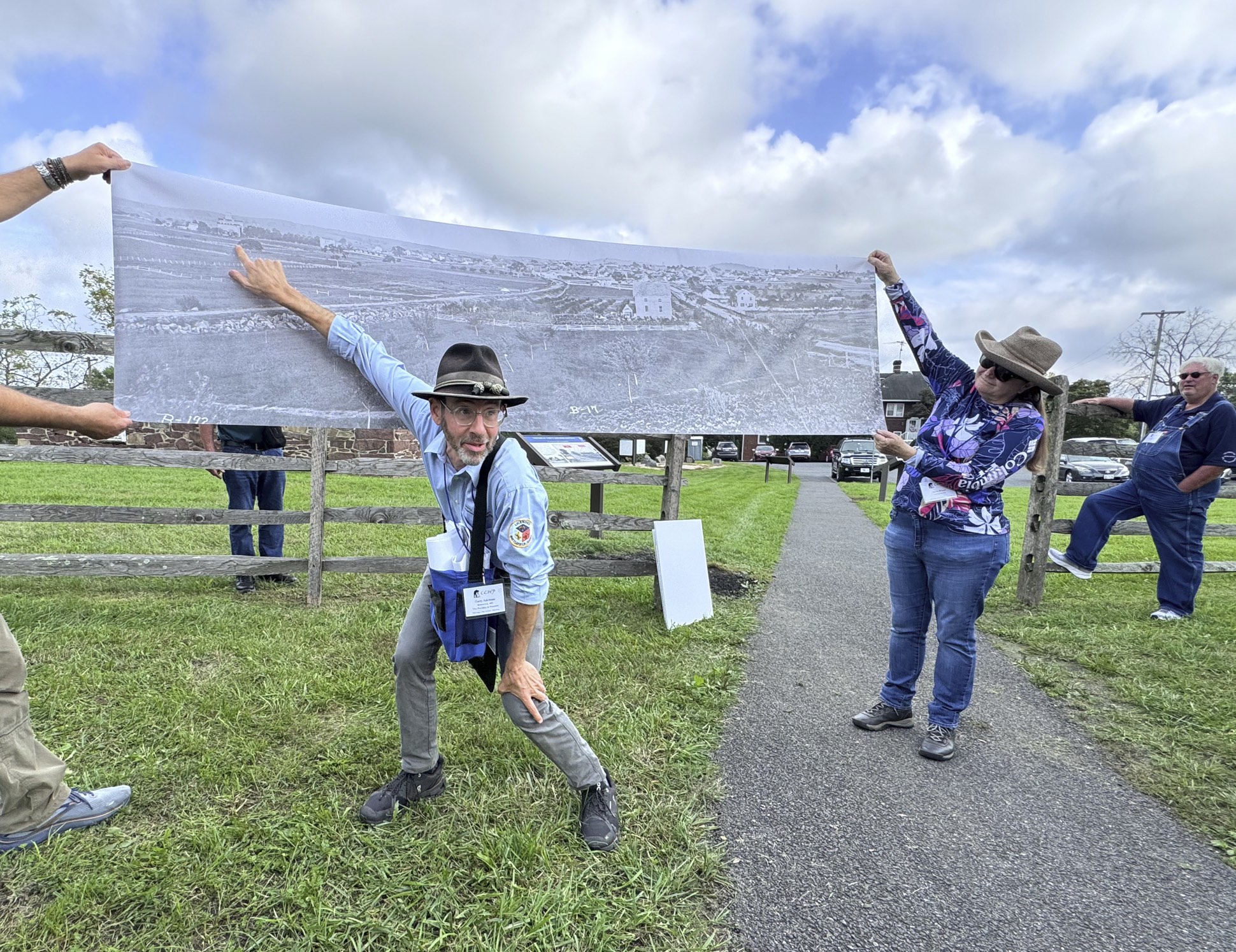 Melissa WinnGarry Adelman uses an enlarged photo on a tour of the Gettysburg Battlefield.